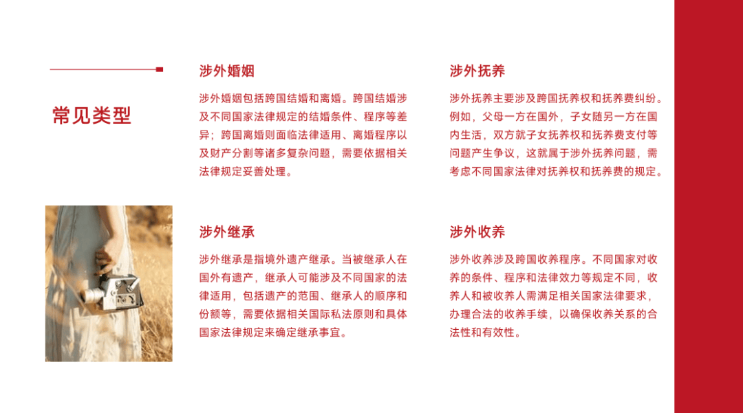 常见的涉外家事类型包括涉外婚姻、涉外继承、涉外抚养、涉外收养等,这些纠纷的处理均需以识别涉外因素为前提,进而确定法律适用规则。
