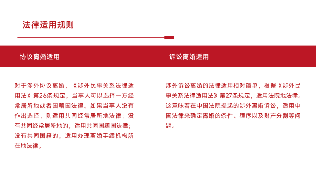 于洋律师强调,涉外离婚的法律适用需区分“协议离婚”与“诉讼离婚”: